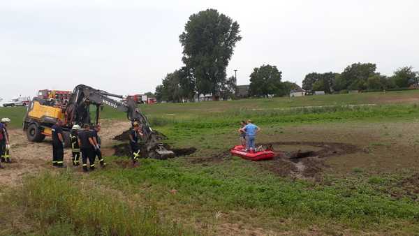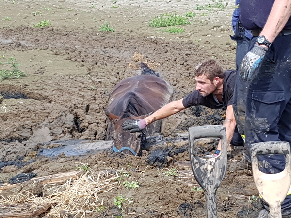 Das Vordringen zu den eingesunkenen Pferden war wegen des aufgeweichten Bodens sehr schwierig. Der herbeigerufene Tierarzt konnte zunächst nur per Schlauchboot an die Tiere heran. Jetzt war Kreativität gefragt: Es wurden durch ein ortsansässiges Tiefbauunternehmen mehrere Bagger an der Einsatzstelle zur Verfügung gestellt. Auch Metallplatten zur Stabilisierung des Untergrundes wurden angefordert. Gegen 12:50 Uhr konnte dann das erste Tier mit Hilfe eines Kettenbaggers aus dem Kolk gezogen werden. Das zweite Pferd konnte schließlich gegen 14:00 Uhr befreit werden.