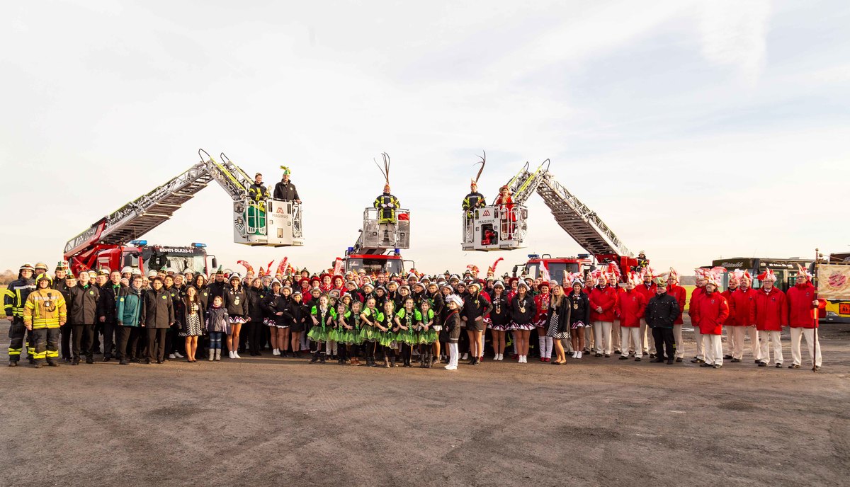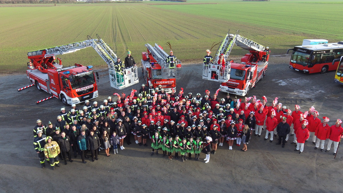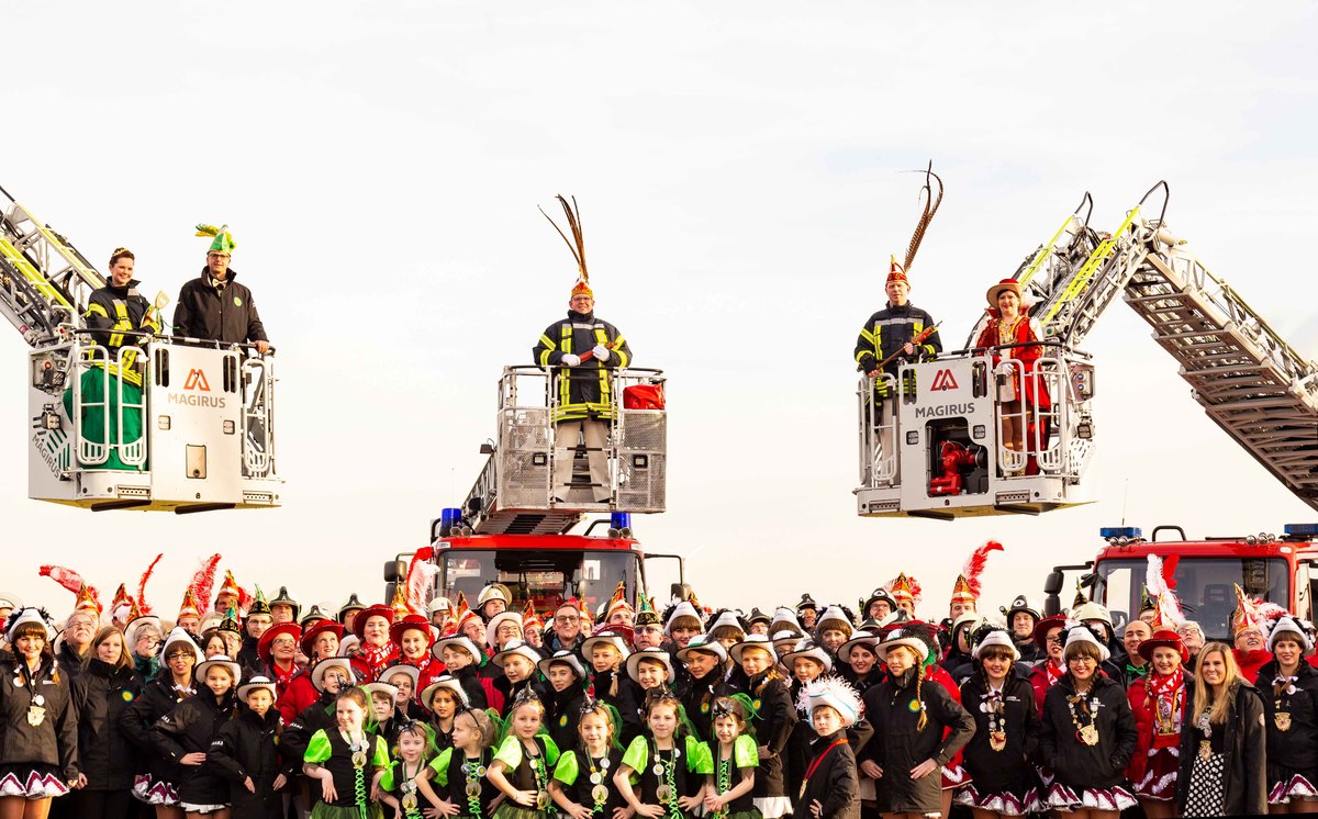 Allen drei Tollitäten liegt die Feuerwehr am Herzen, und so kam die Idee auf, ihr Amt für die Mitgliederwerbung zu nutzen. Zusammen mit den Leitern der drei Feuerwehren ersann man den Plan, gemeinsame Fotos mit Karnevalisten und Feuerwehrleuten zu machen. Die Bilder entstanden auf dem Gelände der Firma Busreisen Andre Stiehl, die auch die Gardebusse stellt.