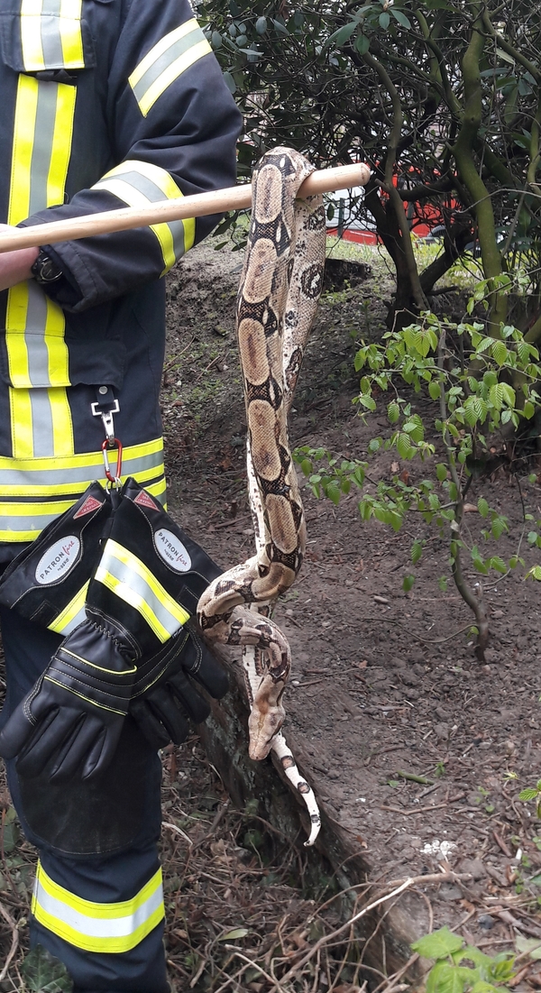 Augenscheinlich schon „verstorben“ und länger dort befindlich, lag die Schlange im Gestrüpp an einem Haus an der Spyckstraße in Kleve. Das regungslose Reptil, vermutlich ein Python, wurde aufgenommen und zur Kontrolle an einen Tierarzt übergeben. Dieser stellte indes aber nicht den Tod fest: Das wechselwarme Tier war wahrscheinlich aufgrund der kühlen Temperaturen in eine Kältestarre verfallen und zeigte nach dem Aufwärmen noch auf dem Behandlungstisch wieder Lebenszeichen.