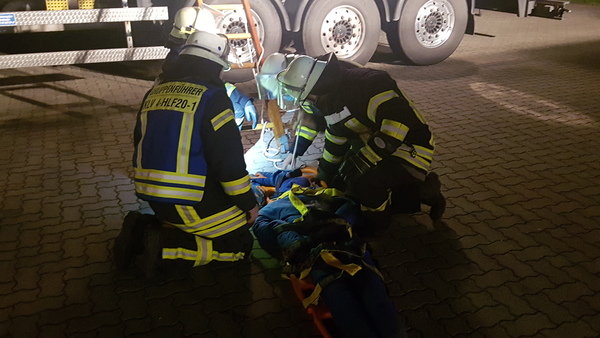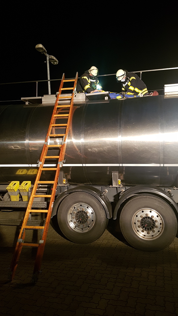 Ziel der Übung war die schonende Rettung einer verletzten Personen aus der Fahrerkabine, sowie die Rettung einer Person, welche Instandsetzungsarbeiten an einem der Domdeckel des Fahrzeuges durchgeführt hatte. Mit vereinten Kräften und unter Einsatz verschiedenster Hilfsmittel meisterten die Kameraden die Übung mit Bravour. Im Anschluss wurde den Kameraden dann die an einem LKW vorhandene Technik nocheinmal durch die beiden Ausbilder näher gebracht, sodas alle noch einmal die Möglichkeit hatten, sich mit dieser vertraut zu machen. Ein Dankeschön geht in diesem Zusammenhang nocheinmal an die Firma Geuyen und Rennings, die den Kameraden des Löschzugs den Sattelzug zur Übung zur Verfügung gestellt hatte.