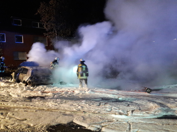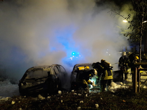 Es wurden vier Trupps unter Atemschutz eingesetzt, die mit drei C-Rohren und einem Mittelschaumrohr die brennenden Fahrzeuge löschen konnten. Letztendlich bedeutete das aber einen Totalschaden für die vier direkt betroffenen Fahrzeuge. Weitere auf dem Großparkplatz stehende Pkw erlitten Schäden durch Hitzeeinwirkungen.