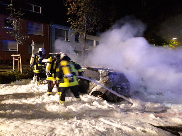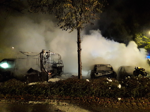 Heute früh (19. Oktober 2020) gegen 3:18 Uhr wurde die Feuerwehr Kleve zu einem Fahrzeugbrand am Parkplatz Großer Markt gerufen. Drei Pkw und ein Wohnmobil brannten völlig aus. Mehrere andere Fahrzeuge erlitten kleinere Schäden, auch durch eine Propangasflasche, die zerknallte und umherflog. Verletzt wurde niemand.