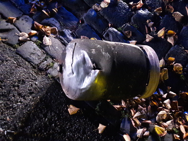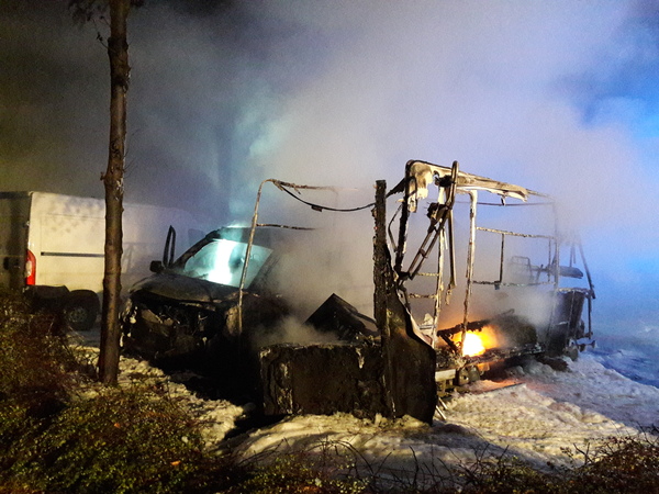 In dem Wohnmobil waren mehrere Gasflaschen gelagert. Nachdem das Feuer auch auf dieses übergegangen war, lösten diese sich aus Ihren Halterungen und fielen auf den Boden. Bei beiden Gasflaschen öffnete sich durch den steigenden Druck das Sicherheitsventil und das Gas trat mit einer Stichflamme aus. Die eingebrachte Wärme war aber so groß, dass eine der Flaschen dem Druck nicht standhielt und zerknallte. Die Flasche flog als Geschoss auf ein in ca. 30 m Entfernung parkendes Auto und hatte danach noch genug Energie, um noch einmal hoch in die Luft zu fliegen, bevor sie nach dem Aufprall gegen eine Hauswand auf die Straße fiel. Die Einsatzkräfte standen dabei aber in sicherer Entfernung.
