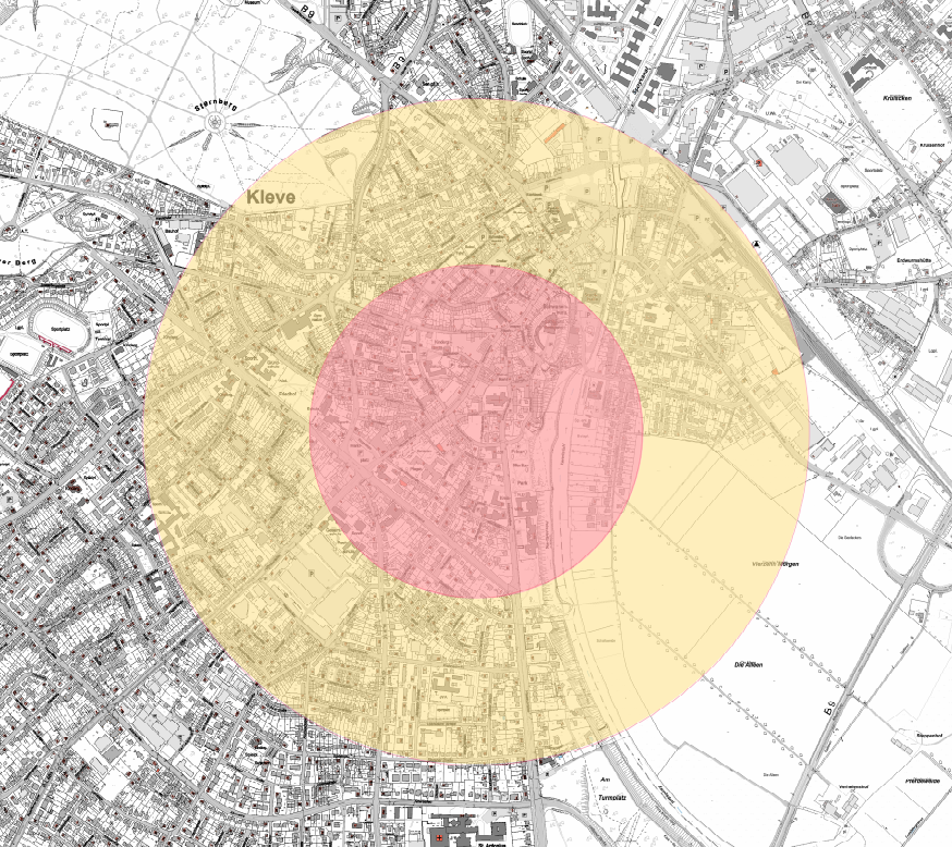 - 2021-03-31 14:50 Uhr Es wurde tatsächlich eine 10-Zentner-Bombe gefunden. Dadurch verdoppelt sich der innere Sicherheitskreis auf 500 m. Die betroffenen Straßen können den Seiten der Stadt Kleve entnommen werden. Die Evakuierung ist bereits angelaufen. Eine Warnung über die NINA-Warnapp wurde soeben verschickt.