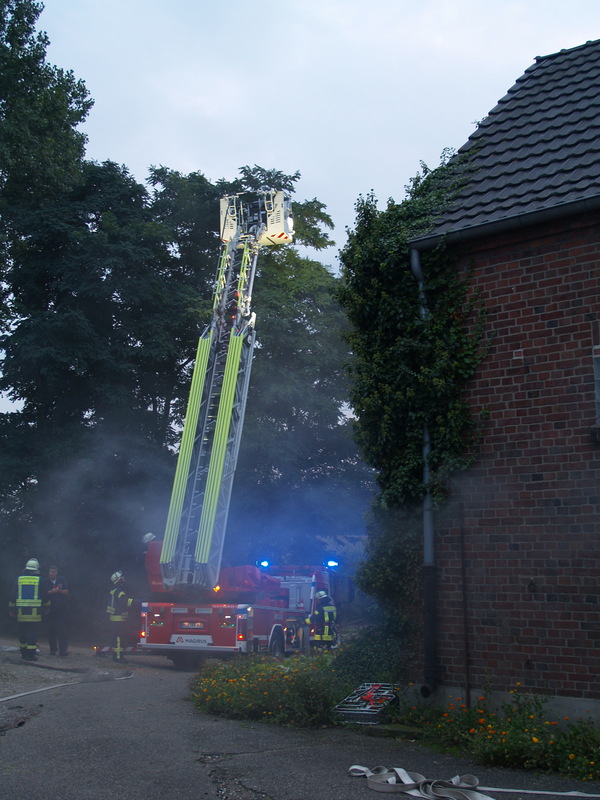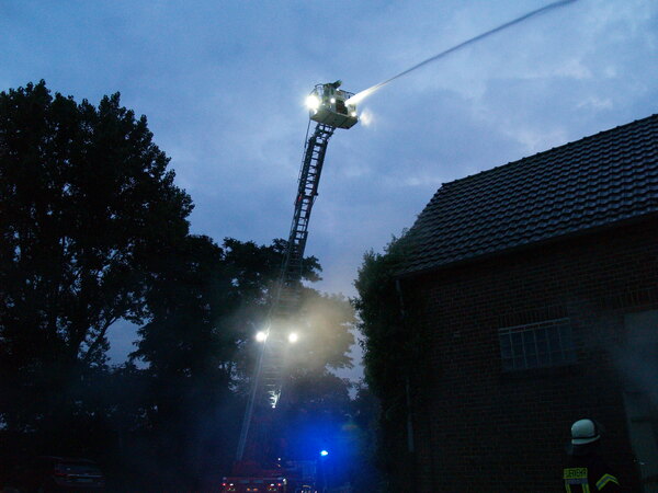 Das Übungsobjekt war diesmal ein landwirtschaftliches Anwesen auf der Rheinhalbinsel Salmorth, dass von den Besitzern freundlicherweise für die Übung zur Verfügung gestellt wurde. In der ehemaligen Betriebswohnung, einem abgetrennten Gebäudeteil, sollte ein Feuer ausgebrochen sein. Vier Arbeiter wurden vermisst. Die ersten Trupps gingen darum natürlich sofort zur Menschenrettung in das Gebäude vor. Gleichzeitig wurde eine Wasserversorgung aufgebaut und ein Löschangriff vorbereitet. Neben den drei Löschgruppen war auch die Drehleiter des Löschzuges Kleve an der Übung beteiligt. Diese wurde in Stellung gebracht, um die Brandausbreitung auf die anderen Gebäude zu verhindern.
