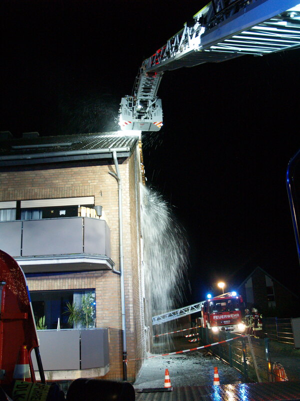 Nachdem die sechs Wohnungen kontrolliert wurden, konnte sichergestellt werden, dass sich keine Menschen mehr im Gebäude befanden. Es wurden auch mehrere Katzen aus den Wohnungen gerettet und den Besitzern übergeben. Der Brand entwickelte sich zwischen Wand und Klinker von der Unterseite des Gebäudes bis zur Dachkante. Dabei wurden auch mehrere Fenster und Rollläden in Mitleidenschaft gezogen. Es konnte aber verhindert werden, dass das Feuer in die Wohnungen eindrang. Das Dach wurde durch die Feuerwehr teilweise abgedeckt, um den Brand von oben mit Löschschaum bekämpfen zu können. Der Einsatz war gegen 21:45 Uhr beendet.