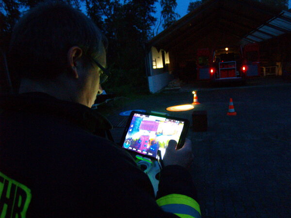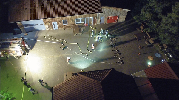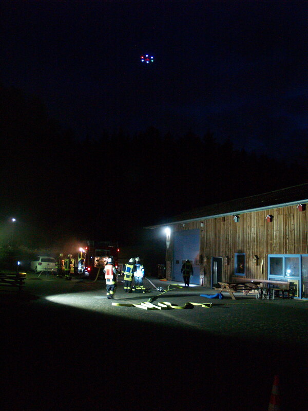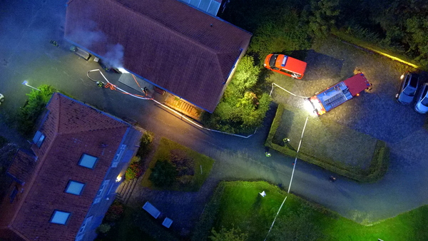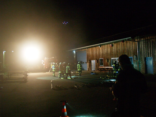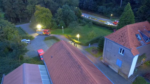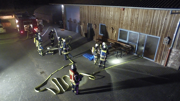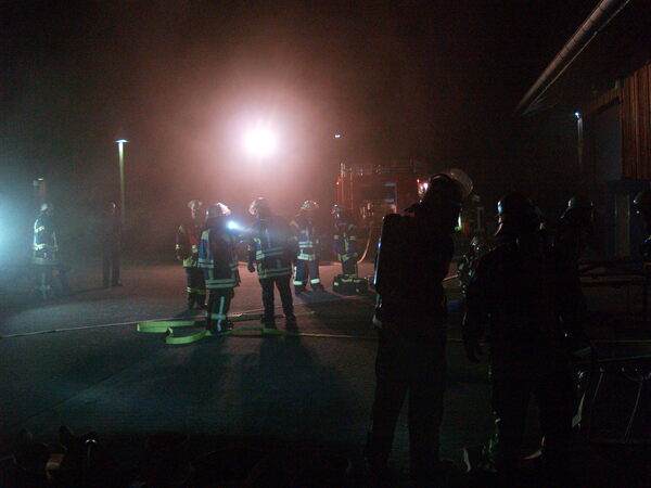 Der Jägerhof besteht aus mehreren Gebäuden, in denen sich auch Werkstätten und Ausbildungsräume befinden. Das Übungsszenario sah vor, dass sich in der Werkstatt im hinteren Gebäude eine Staubexplosion ereignet haben sollte. Brennende Teile waren daraufhin auf ein anderes Gebäude niedergegangen, so dass sich auch dort ein Brand entwickelte. Nach der Erkundung durch den Zugführer wurden mehrere Trupps unter Atemschutz zur Menschenrettung und Brandbekämpfung in den unterschiedlichen Gebäuden eingesetzt. Die zunehmende Dämmerung erforderte zudem den Aufbau von Beleuchtungsmaterial.