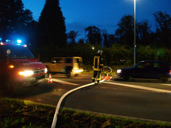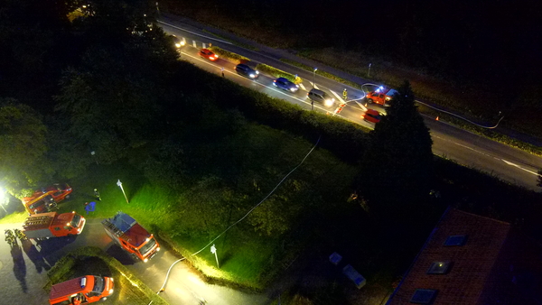 Eine besondere Herausforderung war die Wasserversorgung. Da der Unterflurhydrant auf der gegenüberliegenden Seite der Tiergartenstraße lag, musste eine lange Wegstrecke überbrückt werden, was im ersten Moment viele Einsatzkräfte beschäftigte. Eine Schlauchleitung musste zudem quer über die Fahrbahn der Bundesstraße gelegt werden. Zum Schutz des Schlauches und zum sicheren Überfahren wurden sogenannte Schlauchbrücken eingesetzt.