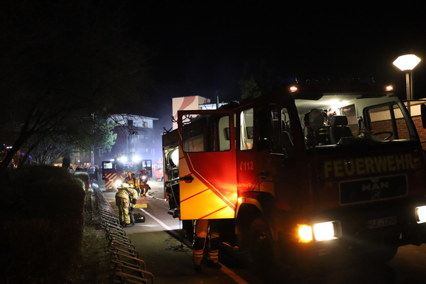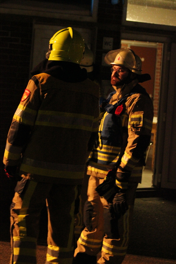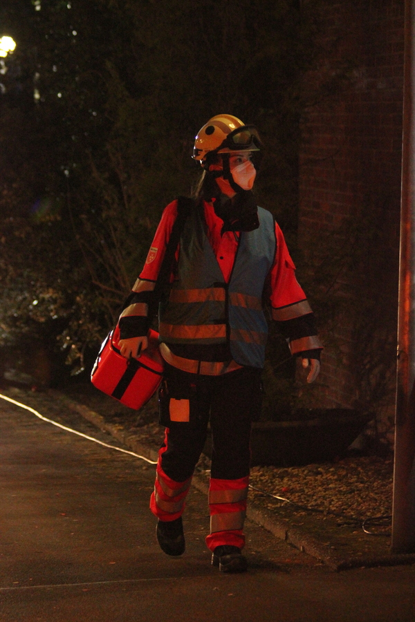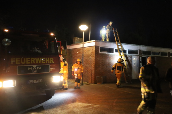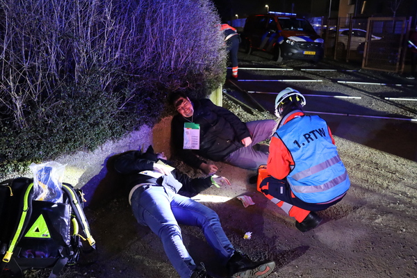 Doch nun zum Übungsszenario. Im Rahmen der Übung bekamen die beiden Einheiten die Meldung, dass es in einer fiktiven Unterkunft für Obdachsuchende zu einer Rauchentwicklung gekommen sei. Bei Eintreffen der ersten Einheiten fand Löschzugführer Jan-Peter Fruhen vom Löschzug Rindern eine sehr unübersichtliche Lage vor: So gab es an mehreren Stellen im Außenbereich brandverletzte Personen, die es zu retten galt. Des Weiteren befanden sich nach Aussage eines Brandverletzten noch sechs Personen im Inneren des Gebäudes. Zusätzlich waren noch zwei verletzte Personen auf dem Dach der benachbarten Umkleide einer Sportanlage, die ebenfalls auf Rettung warteten. Aufgrund der Vielzahl der verletzten Personen wurde daher umgehend der Malteser Hilfsdienst aus Kleve nachgefordert, um bei der Abarbeitung dieses sogenannten „Massenanfalles von Verletzten“ zu unterstützen.