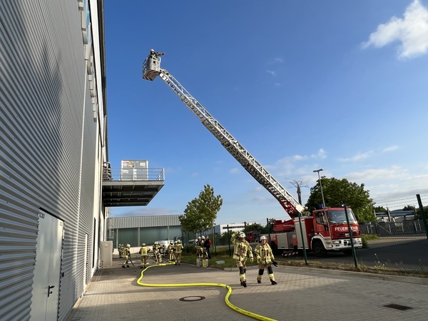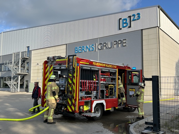 Zu einer geplanten Übung auf dem Werksgelände der Firma Berns in der Boschstraße wurden am Donnerstagabend (1. Juni 2023) die Löschzüge Nordwest (Wardhausen-Brienen, Düffelward und Keeken) und West (Rindern und Donsbrüggen), sowie die Drehleiter des Löschzugs Materborn alarmiert. Es sollte sich zunächst um eine ausgelöste Brandmeldeanlage innerhalb eines Teilbereiches der Halle handeln.
