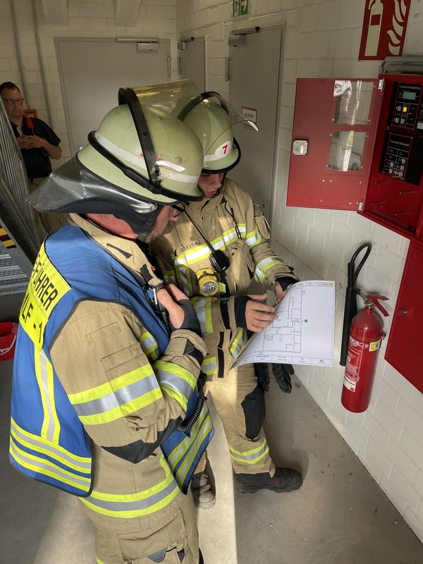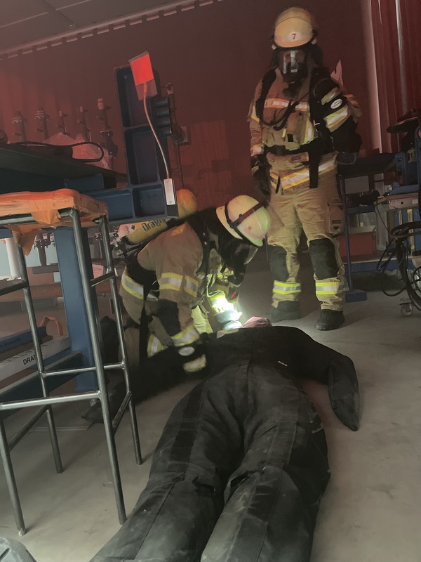 Beim Eintreffen der ersten Kräfte aus Wardhausen-Brienen fanden diese jedoch eine wesentlich herausforderndere Lage vor. So brannte im Szenario der Werkstattbereich einer Industriehalle, in dem mehrere Personen vermisst wurden. Des Weiteren verunfallte in einem angrenzenden Hallenteil ein Lieferwagen, aus welchem ein für die Kräfte unbekannter Gefahrstoff austrat. Aufgrund der umfangreichen Lage forderte Einsatzleiter Jan-Peter Fruhen weitere Einsatzkräfte an und bildete zur Ordnung der Einsatzstelle Bereiche (sogenannte Einsatzabschnitte) in denen die jeweiligen Einheiten parallel den Einsatz abarbeiten konnten. So wurde zeitgleich Hand in Hand die Menschenrettung, Brandbekämpfung und technische Rettung durch Trupps mit umluftunabhängigen Atemschutz durchgeführt. Ebenfalls wurde außerhalb des Gebäudes eine Wasserversorgung aufgebaut und ein Löschangriff vorbereitet. Mit der Drehleiter des Löschzuges Materborn wurden die Dachflächen auf eine weitere Brandausbreitung geprüft. Nach etwa zwei Stunden konnte dann für die 55 Einsatzkräfte ein erfolgreiches Übungsende vermeldet werden. Anschließend gab es dann noch einen gemeinsamen Austausch zum Ablauf der Übung, welcher durch die Berns Gebäudetechnik GmbH u. Co.KG mit Getränken begleitet wurde.