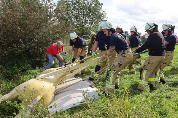 Um die Techniken praktisch zu trainieren, ging es nach der Mittagspause an den Kellener Deich, wo der Pferdedummy „Sam“ wartete, der alle Rettungsversuche geduldig über sich ergehen ließ. So wurde zum Beispiel das Hochziehen aus einem Wassergraben geübt oder auch das Retten eines gestützten Pferdes aus einem Anhänger. Zuletzt wurde auch trainiert, das Übungspferd mit einem speziellen Krangeschirr anzuheben.