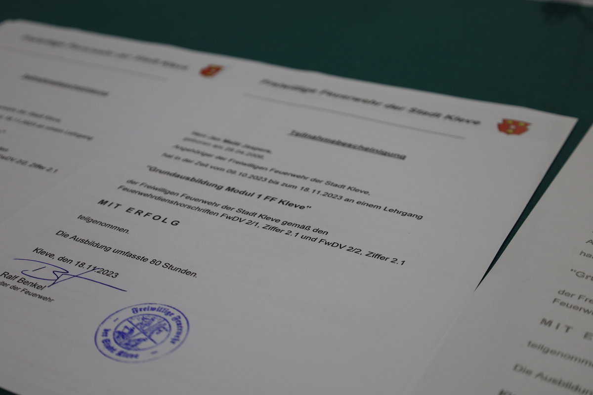 Feuerwehrleute aus Kranenburg und Kleve bestehen den ersten Teil der Grundausbildung