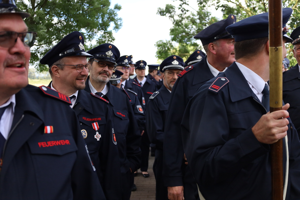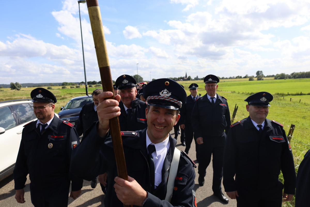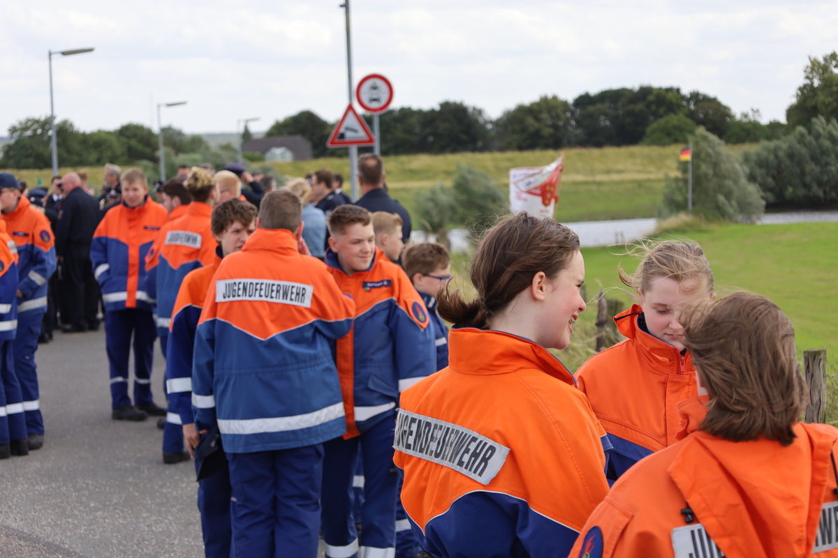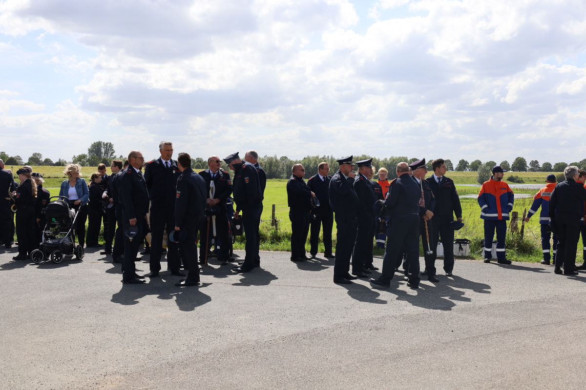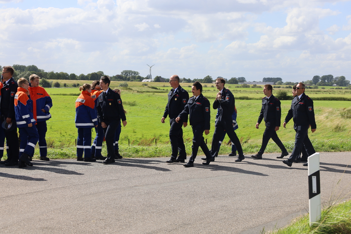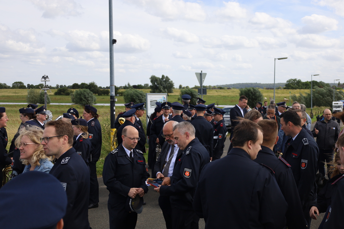 Bei sonnigem, aber windigem Wetter hatten sich die geladenen Gäste und die hunderten Feuerwehrleute am Fähranleger versammelt. Von dort zog man unter Begleitung des Spielmannszuges und des Musikzuges der Feuerwehr in die Ortsmitte, wo sich der Zug vor dem Feuerwehrhaus versammelte.