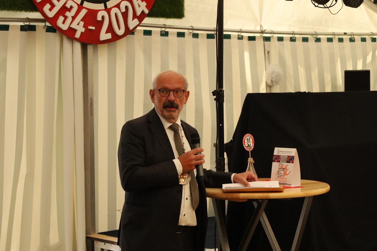 Nach einem Musikstück, das durch Spielmannszug und Musikzug gemeinsam vorgetragen wurde, erklang noch die Nationalhymne. Im Anschluss bewegte sich der Festzug weiter ins Festzelt, wo noch die Ansprechen von Bürgermeister und Kreisbrandmeister folgten. Michael Schweers, der Löschgruppenführer der Löschgruppe Schenkenschanz, wurde dort durch Ralf Benkel und Bürgermeister Gebing zum Brandinspektor der Feuerwehr Kleve befördert. Gegen 20 Uhr begann der öffentliche Feuerwehrball.