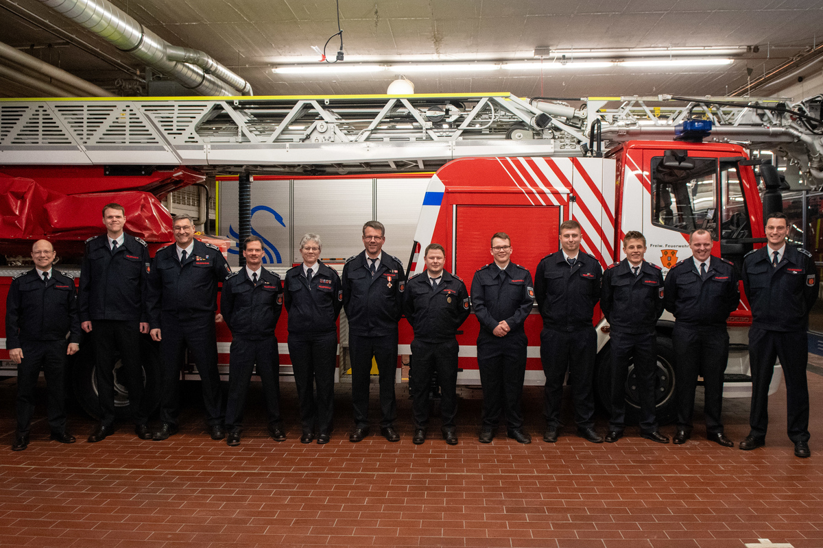 v. l. n. r. Daniel Scholz, Heinrich Graven jun., Ralf Benkel (Leitung der Feuerwehr), Sebastian Schneider (stellv. Löschzugführer), Martina Hendricks, Sven Verfondern (stellv. Löschzugführer), Simon Schott, Dominik Becker, Ricco Dickerboom, Jessin Zeitler, Carsten Stamm, Eric Praast (Löschzugführer)