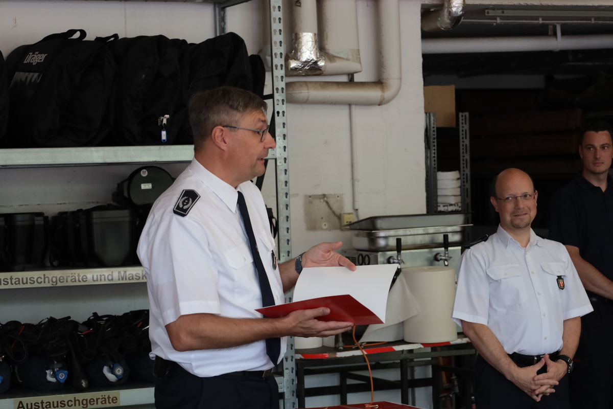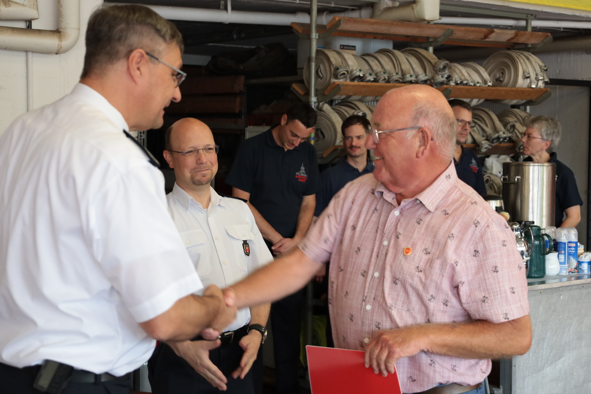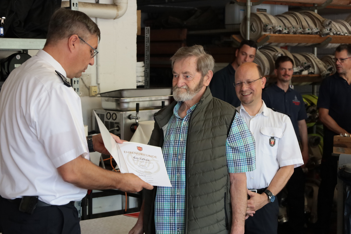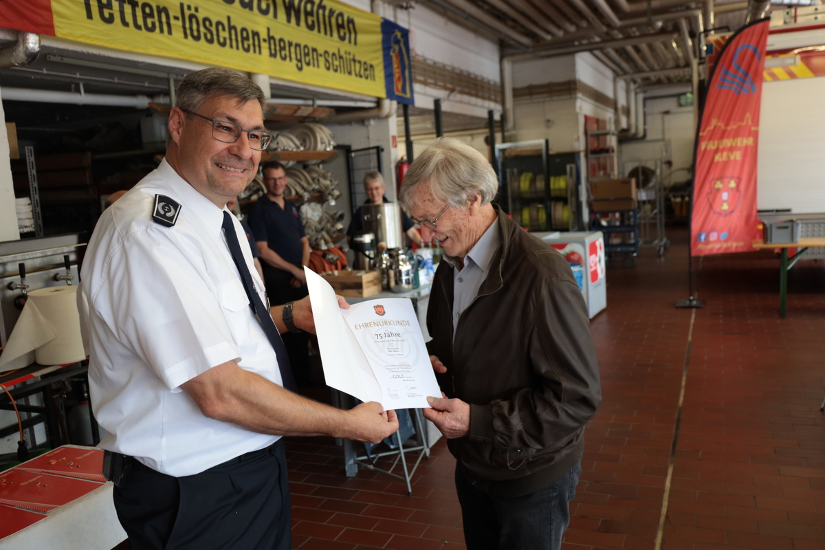 Eine ganz besondere Ehrung galt Karl Nielen für beeindruckende 75 Jahre Mitgliedschaft. Er trat am 1. August 1950 – nur fünf Jahre nach dem Ende des Zweiten Weltkriegs – in die Feuerwehr ein. Seine jahrzehntelange Treue, sein Engagement und seine Verbundenheit zur Feuerwehr verdienen höchsten Respekt und Anerkennung. Mit großer Dankbarkeit durfte ihm der Leiter der Feuerwehr, Ralf Benkel, die Ehrenurkunde überreichen.