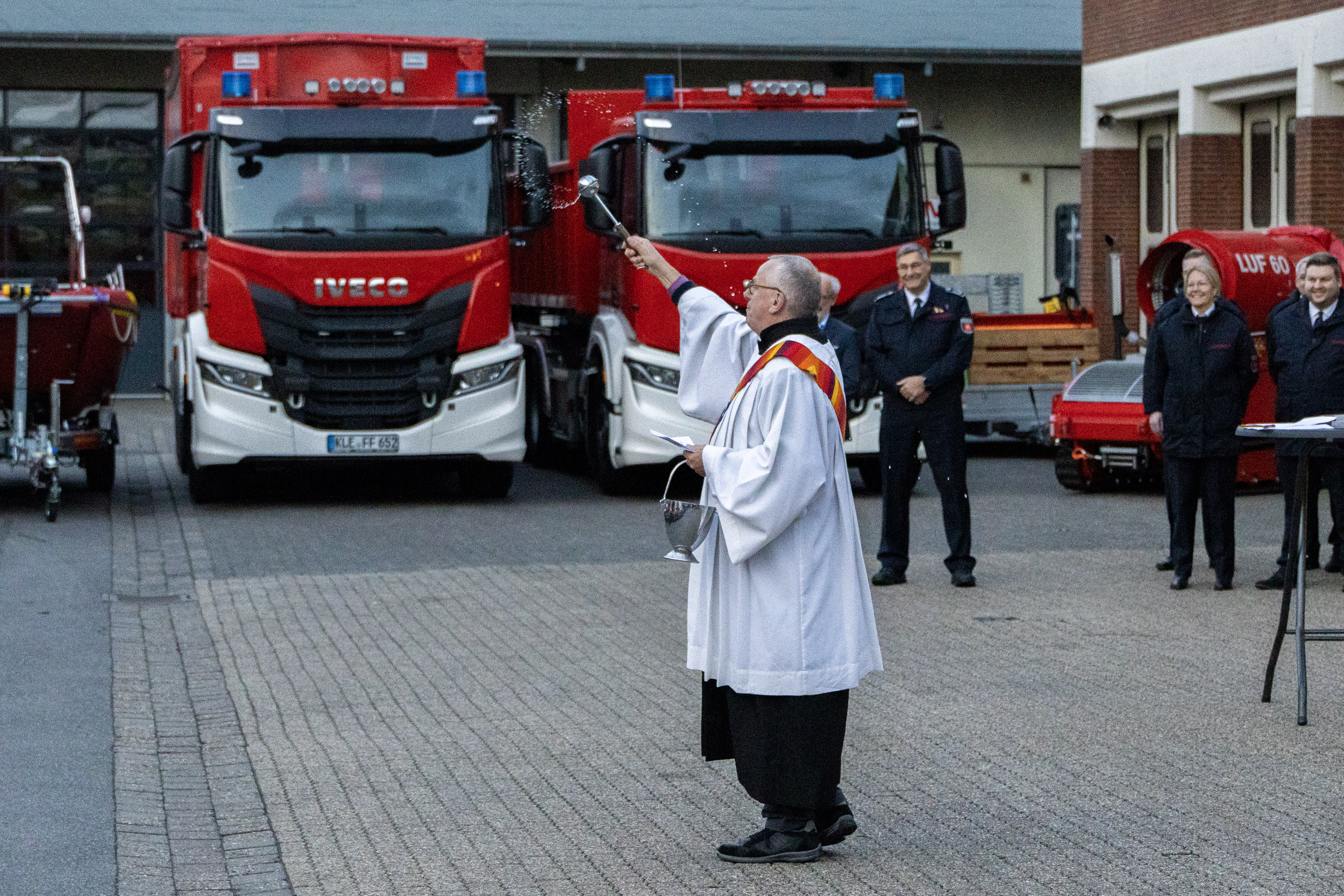 Diakon Michael Rübo stellte den Schutzgedanken in den Mittelpunkt der Einsegnung: „Der Segen ist da, wo am Ende wohl ein Schutzengel war.“ Er bezog sich dabei auf Momente, in denen Einsätze knapp glimpflich ausgehen oder auch schnell Schlimmeres hätte passieren können – und segnete sowohl die Fahrzeuge als auch die anwesenden Mitglieder der Feuerwehr.