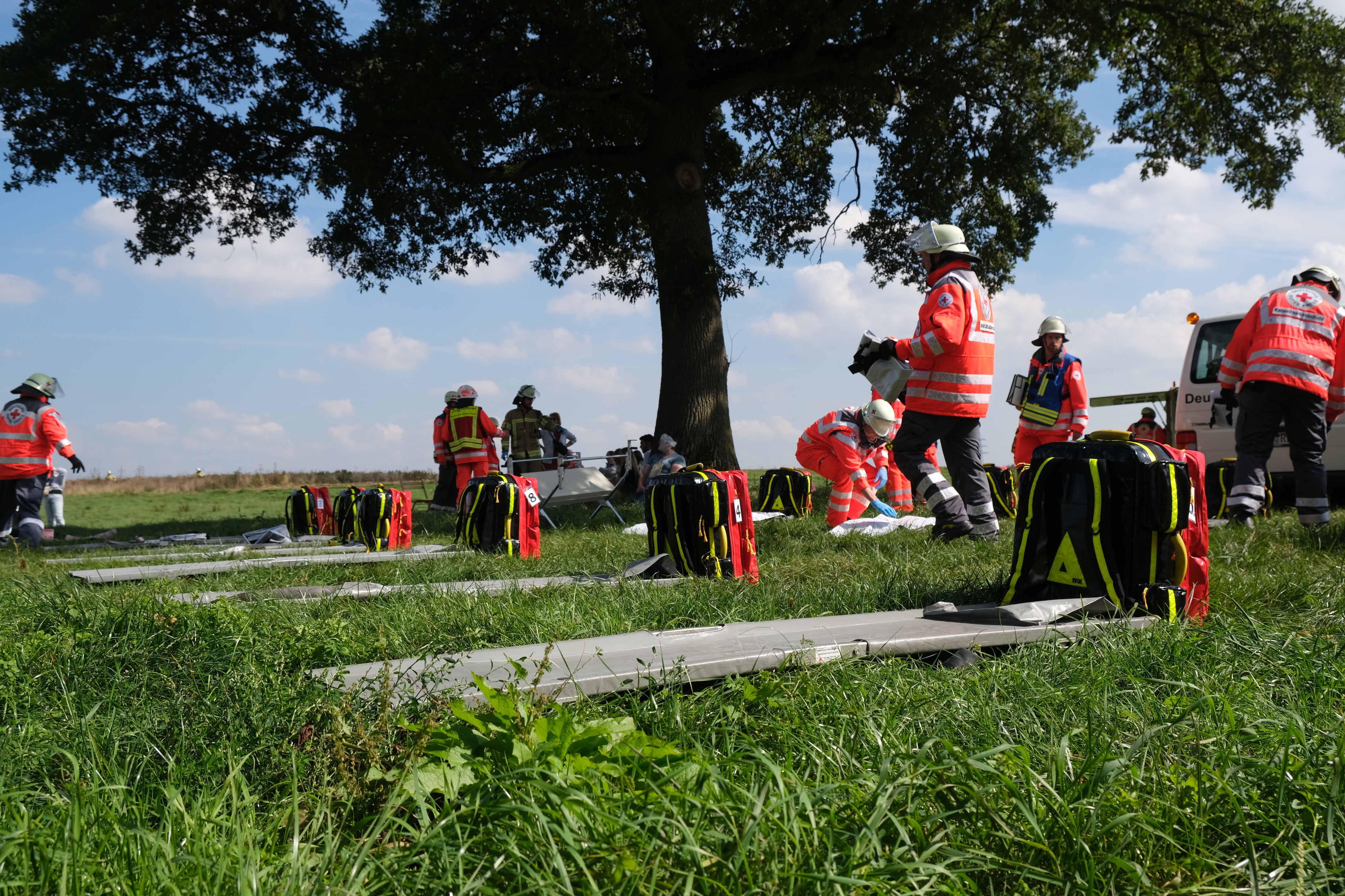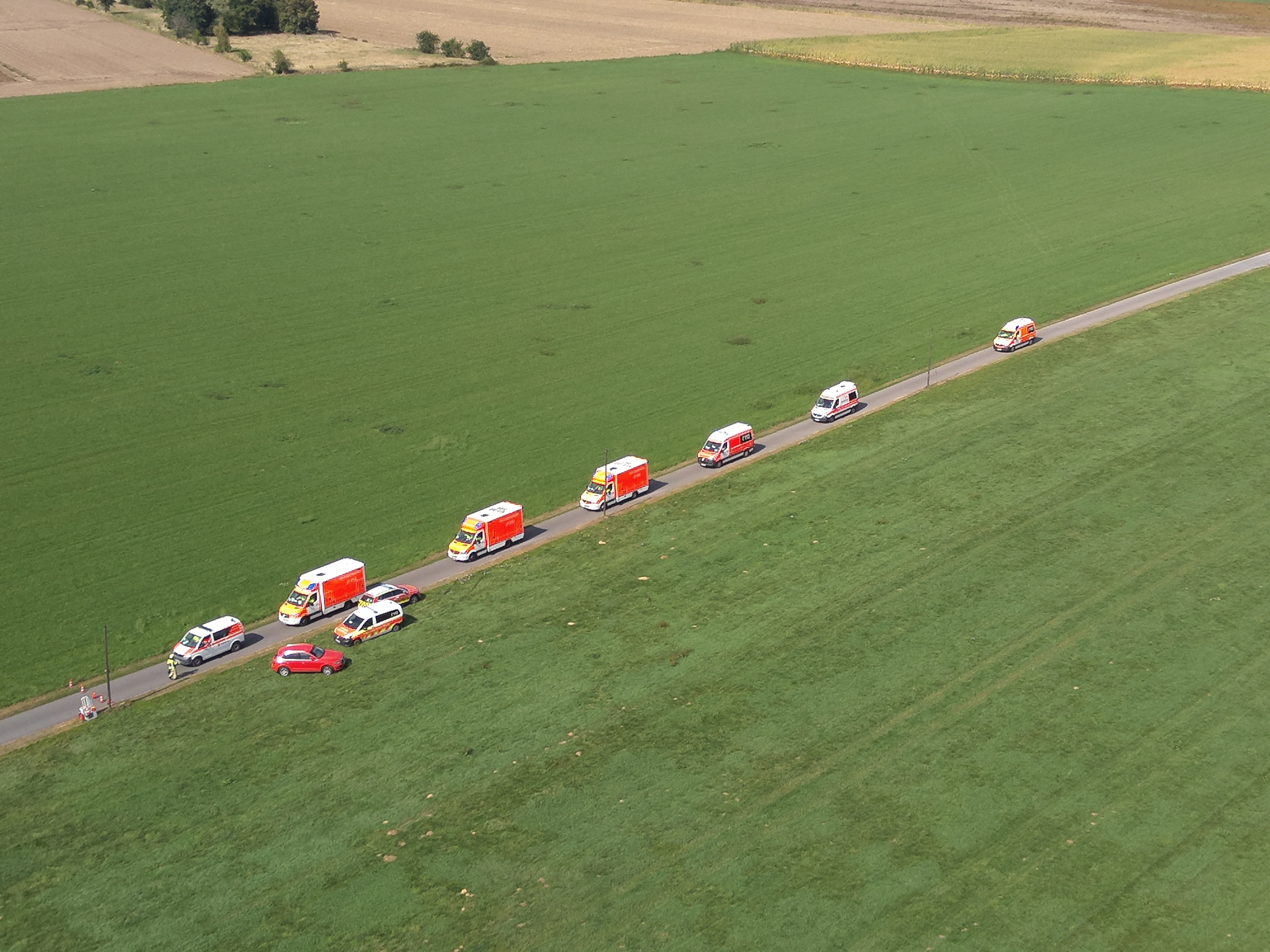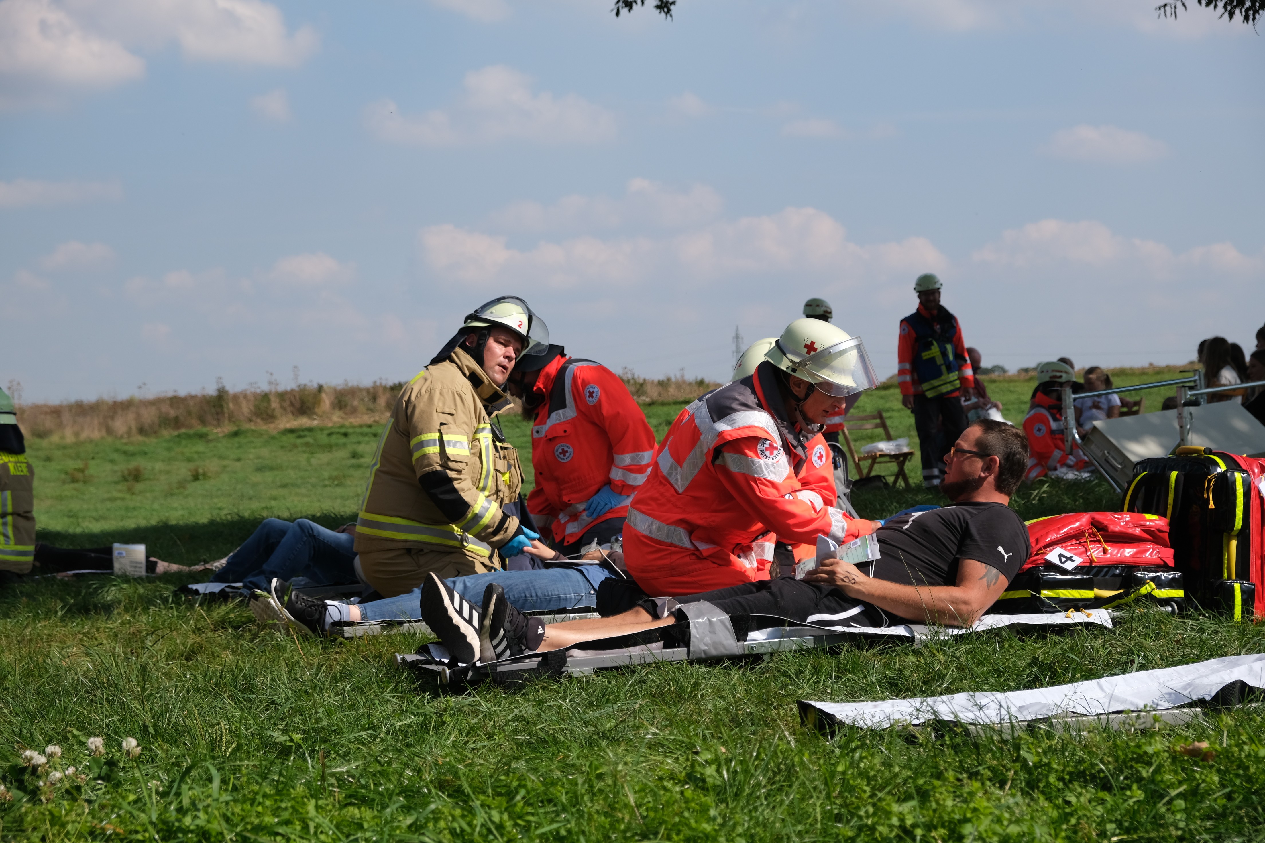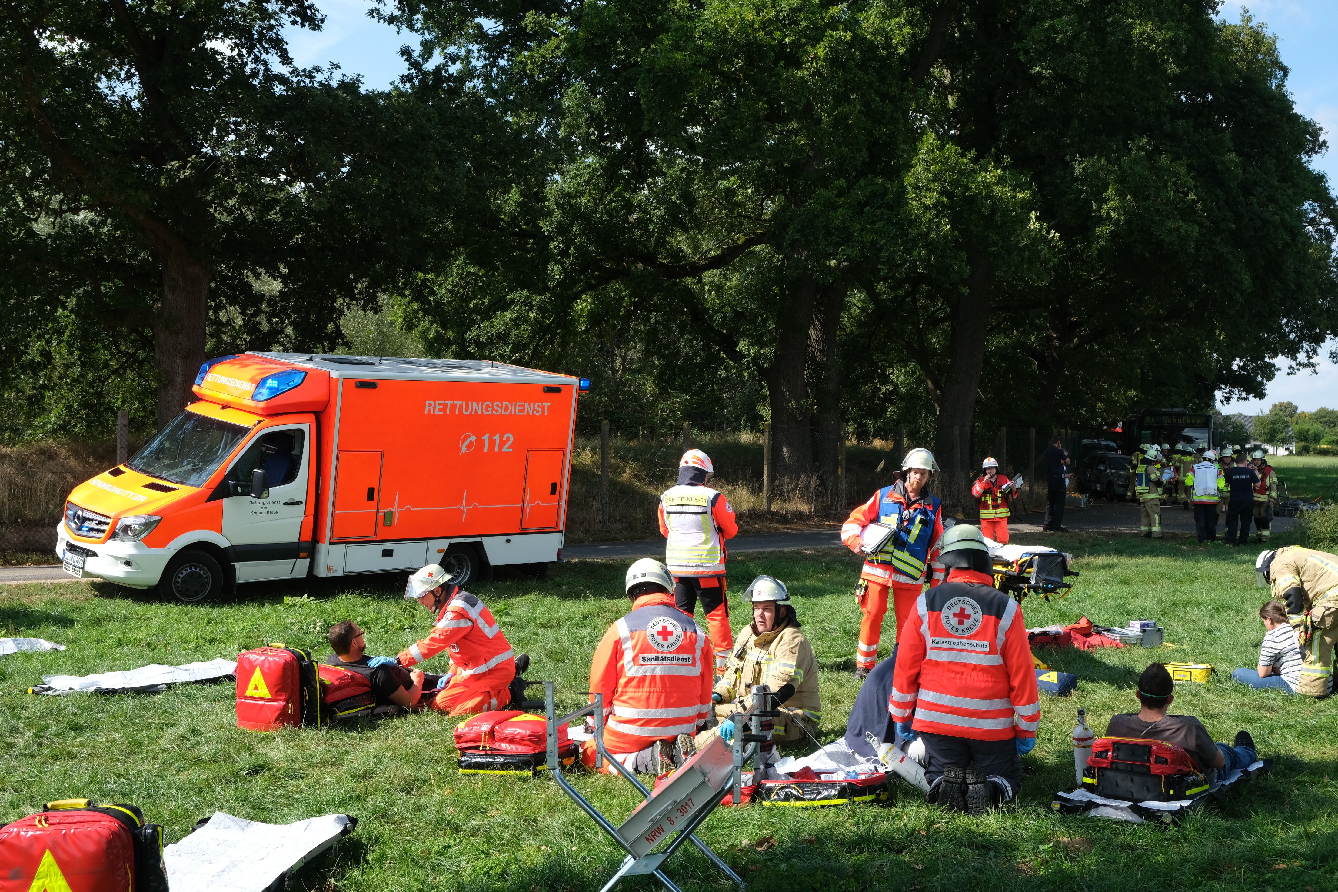 Ein nicht alltägliches Übungsszenario sollte auf die Einsatzkräfte zukommen: Ein Reisebus war mit einem Pkw kollidiert, der wiederum eine Fußgängerin angefahren hatte. Nach der Erkundung stellte sich heraus, dass insgesamt 26 Personen betroffen waren. Einige befanden sich noch in den Fahrzeugen, andere hatten diese bereits eigenständig verlassen. Der Einsatzleiter rief einen Massenanfall von Verletzten (MANV) aus. Damit werden im Ernstfall automatisch zusätzliche Kräfte alarmiert – in diesem Fall eine Einsatzeinheit des Deutschen Roten Kreuzes, der Rettungsdienst des Kreises sowie der Malteser Hilfsdienst.