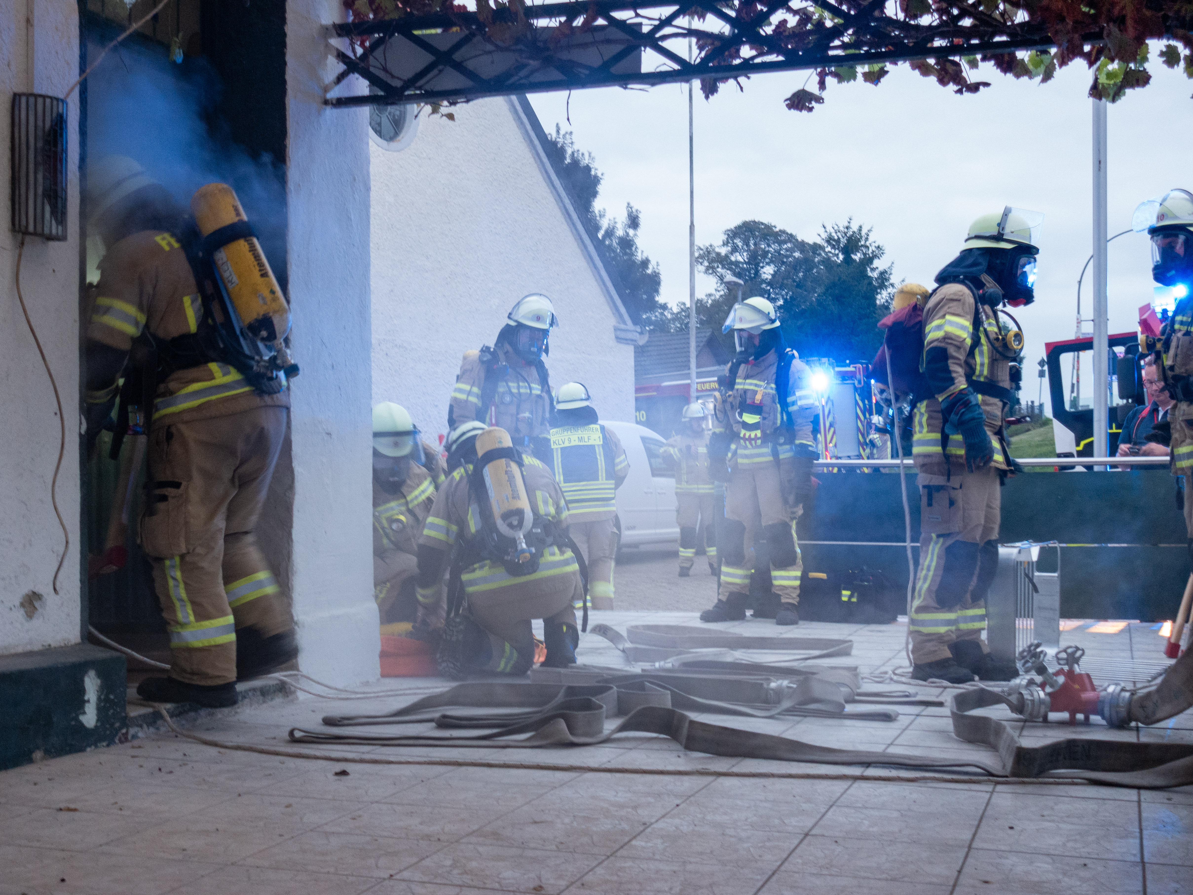 Die Einsatzkräfte teilten sich in drei Abschnitte auf: Die Menschenrettung unter Atemschutz im verwinkelten Innenraum, die Wasserversorgung und den Löschangriff einschließlich der Bekämpfung von Bränden nahe zwei Gastanks im Außenbereich sowie die Betreuung der Verletzten. Insgesamt waren 26 Kräfte beteiligt. Vor der Abfahrt hatten sich die Mannschaften bewusst durchmischt, sodass die Vorteile der einheitlich aufgebauten MLFs der Klever Feuerwehr voll zum Tragen kamen. Dadurch fanden sich die Einsatzkräfte auch auf fremden Fahrzeugen schnell zurecht.