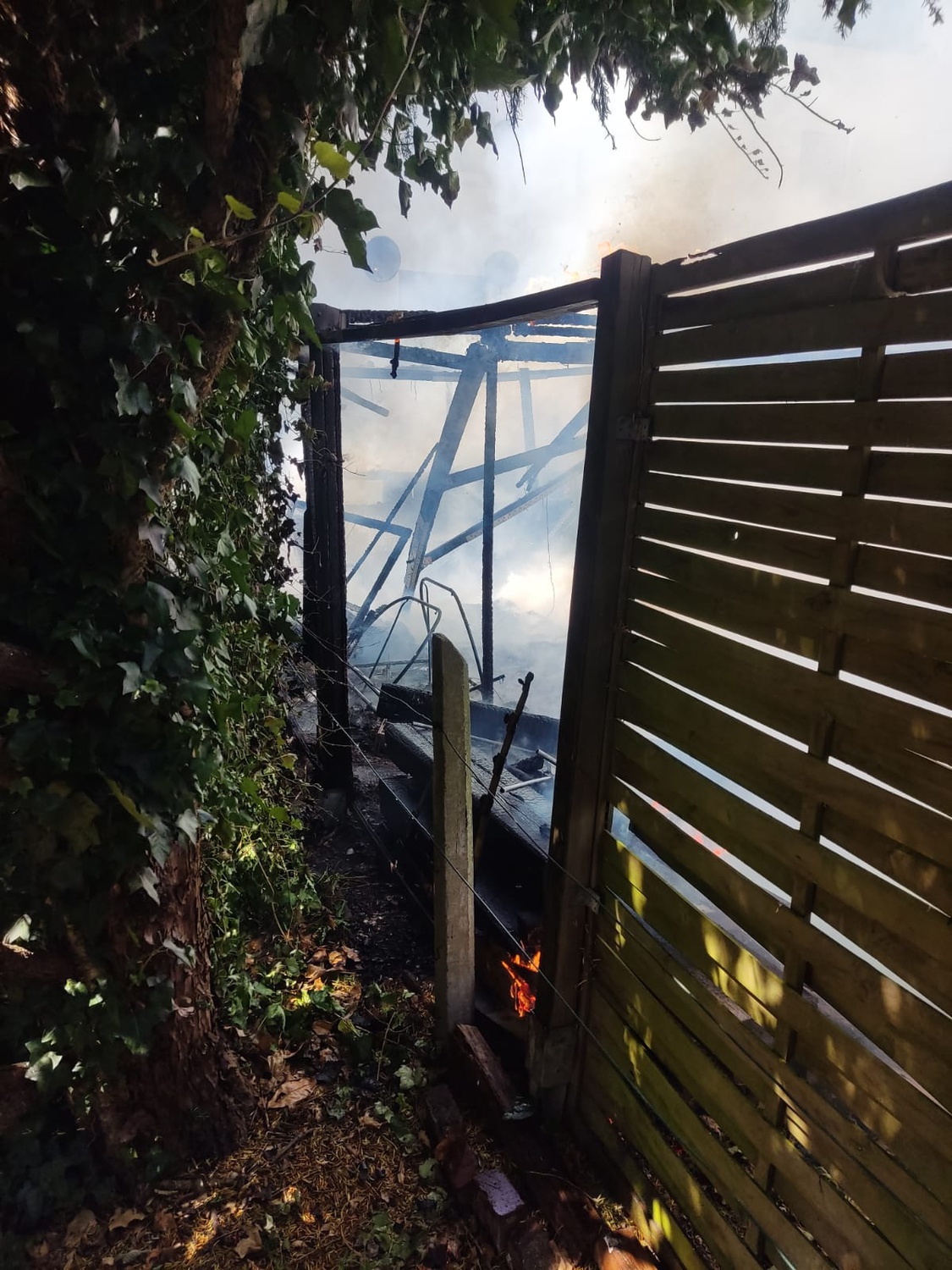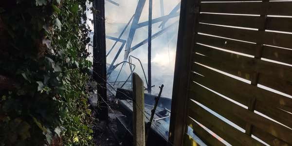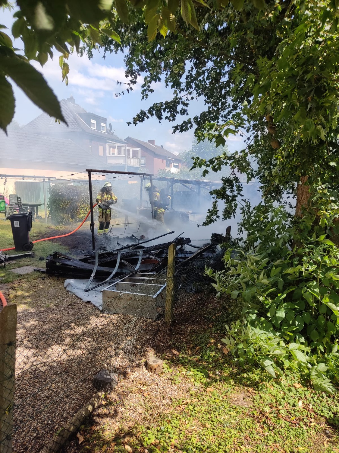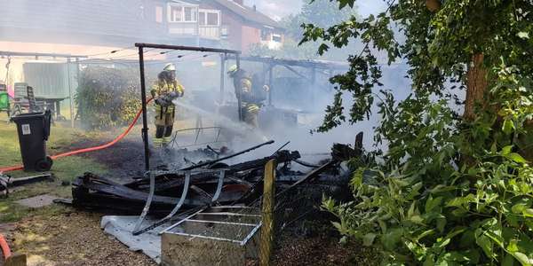 Beim Eintreffen der ersten Kräfte stand eine größere Gartenhütte bereits in Vollbrand. Die Flammen drohten, auf das anliegende Wohnhaus überzugreifen.