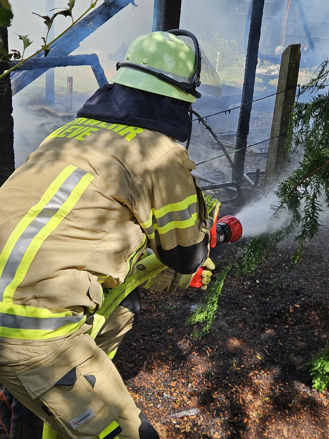 Abschließend wurde das Brandgut mit Löschschaum bedeckt, um ein erneutes Entflammen durch Glutnester zu verhindern.