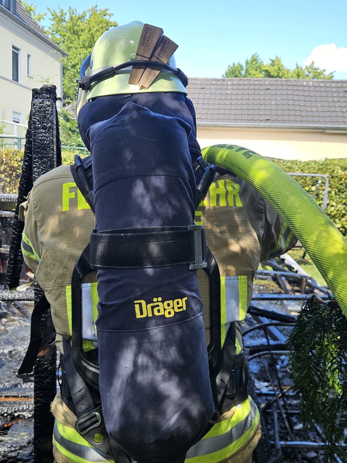 Daher setzte Zugführer Marc Böhmer umgehend einen Trupp mit umluftunabhängigem Atemschutz ein, welcher mit Hilfe eines Strahlrohres eine Riegelstellung zwischen Haus und Gartenhütte schaffte. So konnte die weitere Brandausbreitung gestoppt werden. Parallel wurde durch weitere Einsatzkräfte die Brandbekämpfung vorgenommen und eine Wasserversorgung verlegt. Das Feuer konnte so schnell und effizient bekämpft werden.
