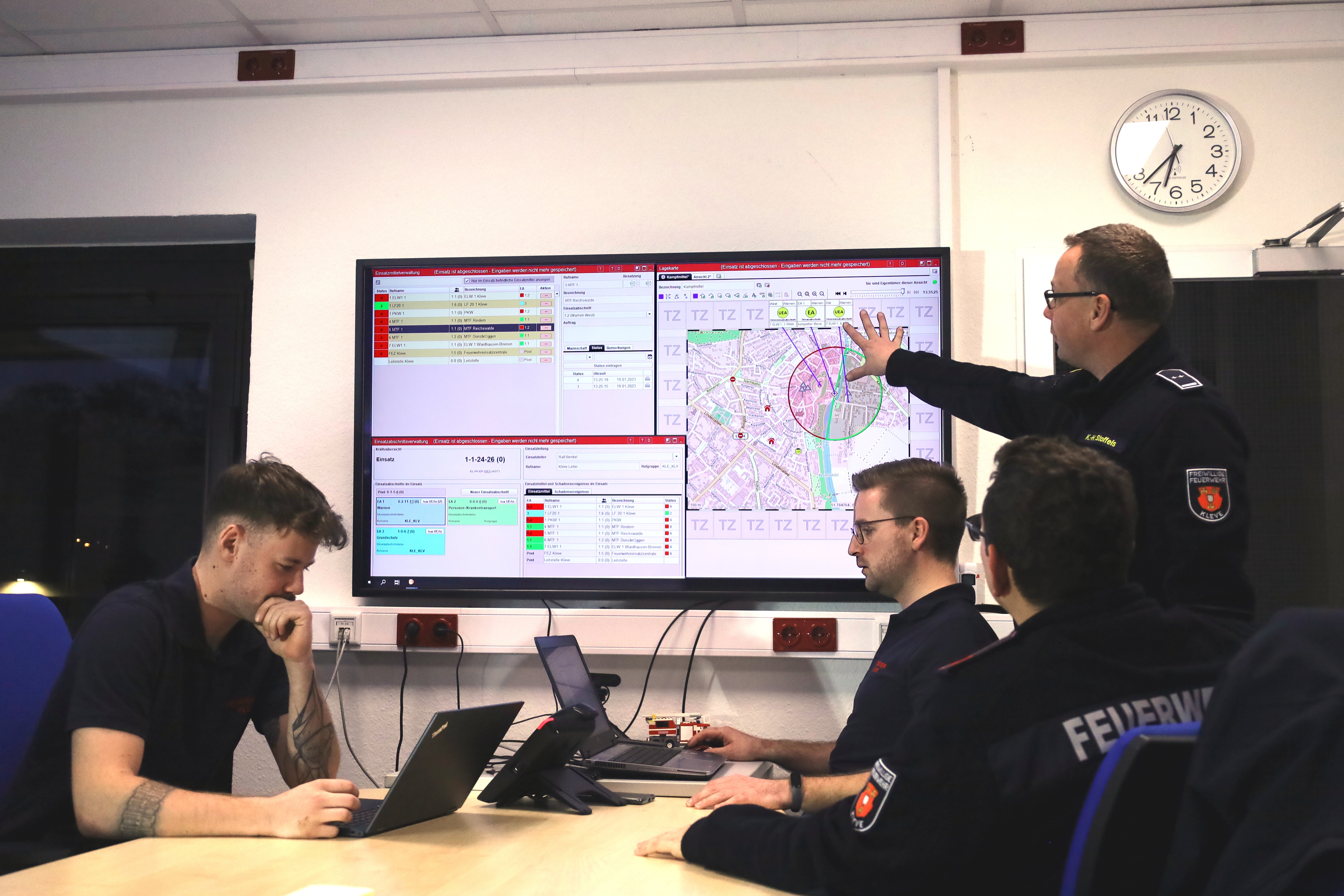 Neue Technik wirkt nur, wenn sie verstanden und trainiert wird. In Kleve wurden die großen Schritte in praxisnahen Arbeitsgruppen mit Einsatzkräften aus verschiedenen Einheiten vorbereitet. Schulungen sicherten, dass aus „neuer Software“ ein alltagstaugliches und unterstützendes Werkzeug im Einsatz wird. Nach Einsätzen fließen digitale Protokolle (Einsatztagebuch, Aufträge, Status) in die Qualitätsschleife: Erkenntnisse werden greifbar und anschlussfähig, Anpassungen an Checklisten, Alarm- und Ausrückordnung oder Alarmdisplay-Hinweise dadurch gezielt und nachvollziehbar. Gleichzeitig bleiben Fallbacks geübt: Papierlagekarte, definierte Meldewege und klare Führungsstrukturen greifen, wenn Technik einmal ausfällt. Digitalisierung ist bewusst mit Redundanz gedacht.
